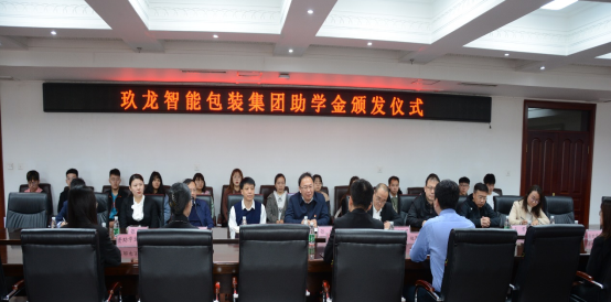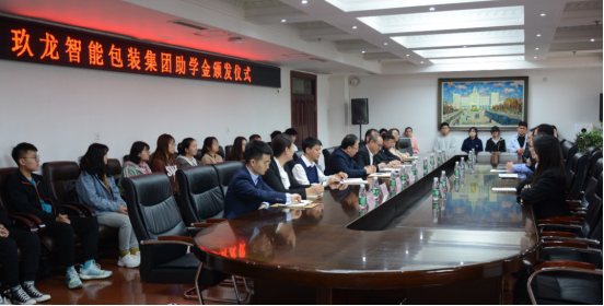 黄海强对商大的人才培养模式表示认可,对已经在玖龙工作的毕业生给与了高度评价,对校企合作进行了憧憬。赵亚强宣读获得助学金学生名单,祝贺获得助学金的4名同学。希望受助同学不忘初心、勤奋学习、砥砺品行。助学金获得者代表肖玉玲则表明她们会用实际行动回报这份关怀,传承玖龙智能包装集团“奉献爱心,回报社会”的企业文化理念。