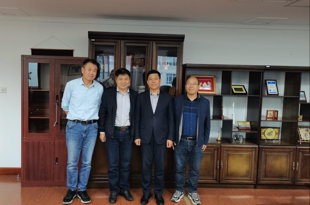 校长郑秋鹛、副校长姜国峰、副校长王巍与校友吴少威合影