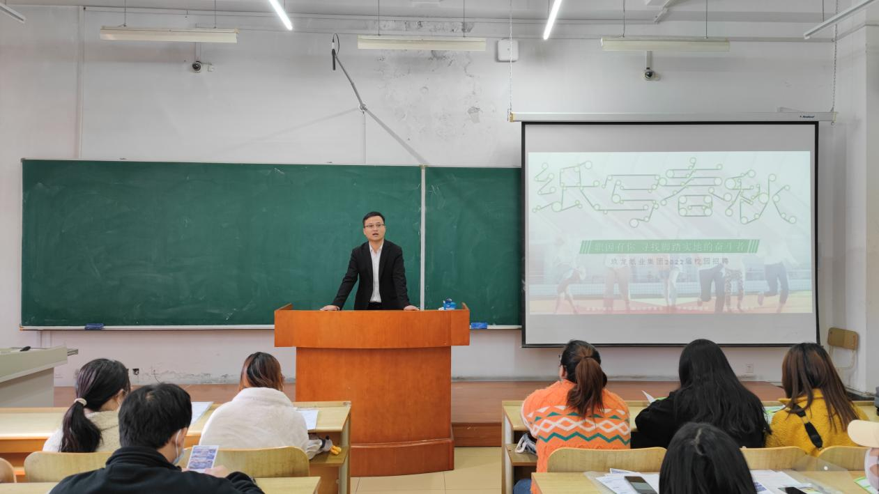 上午10时,玖龙智能包装集团专场招聘宣讲会在我校主0101室举行。刘聪介绍此次进行宣讲招聘的玖龙智能包装集团的三位负责人,并介绍了玖龙智能包装集团的公司概况、发展历程等。
