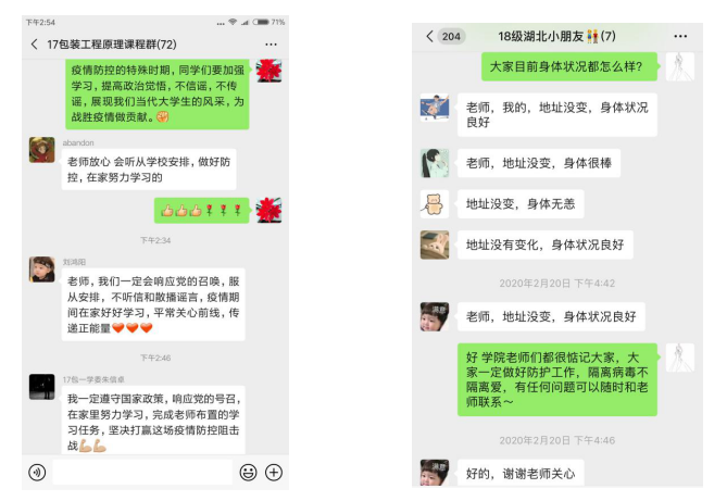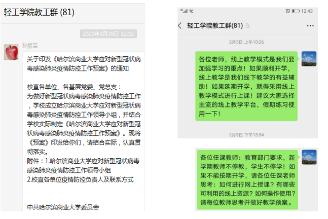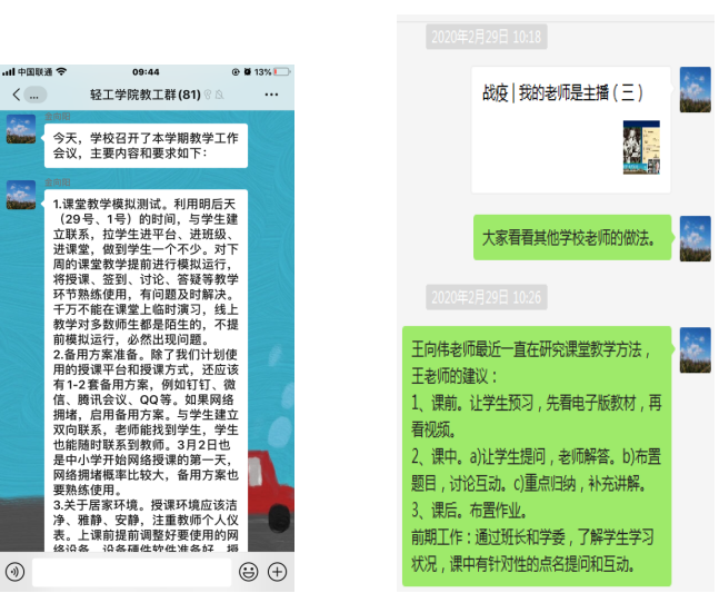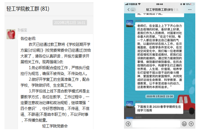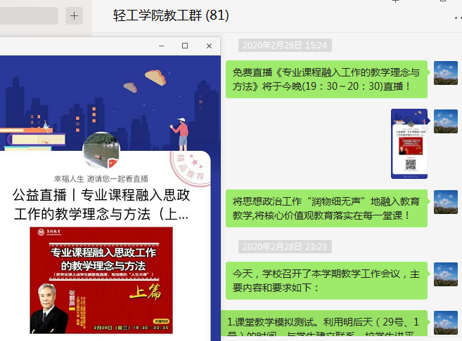 3、开会交流:轻工召开了全院教师视频工作会议,传达学校教学工作会议精神,布置学院近期工作,建立疫情防控领导小组。各专业进行教研室讨论,交流软件操作技巧,授课模式,制定授课计划和线上教学授课大纲。学院教学秘书搭建关键桥梁,及时发布信息、沟通解决师生问题。
