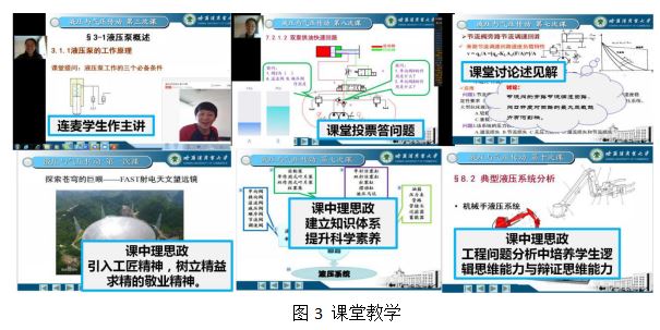 为保证教学效果,根据教学内容及学生自主学习情况,开展讨论、研讨、讲授等多种教学活动。采取20-30分钟的短课来加强课堂教学中学生的专注性。课堂教学中将知识点和思政要点结合,例如介绍探索苍穹的巨眼FAST射电天文望远镜中的液压传动技术,引入工匠精神,帮助学生树立精益求精的敬业精神。线上教学老师不能直面同学,为增加互动有效性,教师应注意以下细节问题:1)精心设计课堂提问,通过点名、投票及抢答等多途径了解学生知识掌握情况,利用课堂间隙积极与同学沟通;2)教学过程中注意活跃课堂气氛,用丰富语言与互动吸引学生,避免晦涩难懂的知识使学生游离课堂。