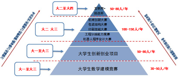 轻工学院以大学生创新创业训练计划项目为依托,建立了以“互联网+”“挑战杯全国大学生创新创业”大赛为龙头,以“数学建模竞赛”为基础,以“大学生创新创业项目、机械创新大赛、包装结构大赛、印刷技能大赛、工程训练能力竞赛、机器人程序设计大赛、机器人与人工智能大赛”为构架的“三层次”竞赛体系,提升大学生创新创业能力。