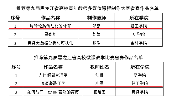 学院高度重视和积极参与此项活动,广泛宣传,认真组织,为青年教师参赛创造条件,学院还邀请了专家对参赛作品进行指导。经过学校外请专家评审,邓薇老师的作品“周转轮系传动比的计算”获校赛一等奖,巩雪老师的作品“啤酒灌装工艺”获校赛二等奖,两个作品被推荐参加第九届黑龙江省高校青年教师多媒体课件制作大赛和微课大赛。