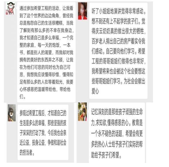 活动中,大家观看了《希望在你身边》宣传片,参观了黑龙江省希望工程文化室;通过基金会老师的讲解,同学们了解了黑龙江省希望工程实施25周年以来关于爱和希望的故事;在得知百岁爱心老人张庆云为教育奉献的感人故事后,对黑龙江省希望工程有了更深层的了解,感慨不断,有些同学甚至流下了感动的泪水。 参观以后同学们认真写下了自己对这次活动的深刻体会,大家对黑龙江省青少年发展基金给予这次参观学习的机会表达了感谢,并要在今后积极参与黑龙江省希望工程的公益活动,尽自己的绵薄之力,帮助更多的人。