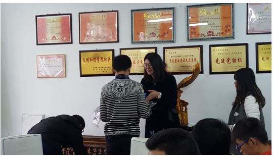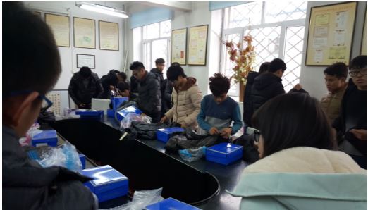 随后,学院勤工助学中心的学生为参与本次活动的学生发放过冬的羽绒服及棉鞋,同学们在现场都纷纷试穿了自己的衣物。一件件厚实的棉衣,一双双崭新的棉鞋,代表了学校及学院对莘莘学子的深切关心,来自五湖四海的同学们也深深地感受到了这份温暖的关爱。