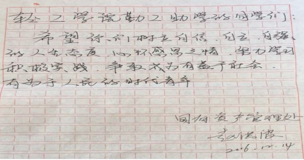 张老师也传达了学院党委对同学们的叮嘱,命运在关上一扇门的同时,也一定打开了一扇窗,生活上暂时的困难能激励人在逆境中成长,成长中的磨砺会增强未来面对各种局面的本领,本领的提升可能成就一个更丰满的人生。大家要正确看待现状,将困难转化为动力,怀抱希望、脚踏实地、自力更生,用出色的学业成绩为自己争取更多机会、积极参加勤工助学活动,成就更加优秀的自己。