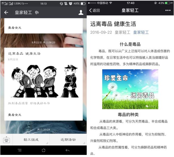 借助网络宣传。通过在公众号“皇家轻工”中推送“远离毒品,健康生活”的文章让更多的人了解认识到拒绝毒品、远离毒品的重要性,并且通过同学们的转发,话题正在持续升温。