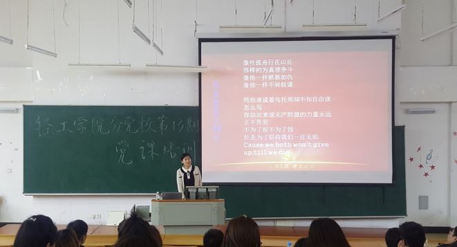 本期党课由马克思学院宋真书记,轻工学院潘鹏杰书记、张铁锋副书记、会计学院刘天副书记和轻工学院团委书记任婵媛分别从《结合习近平总书记“七一”重要讲话,推进“两学一做”学习教育》《党的基本理论、路线、纲领》《党的组织制度和纪律》《党的先进性建设的重要意义》《端正入党动机,争取早日入党》等方面对入党积极分子、拟发展对象和新党员做了系统的培训。