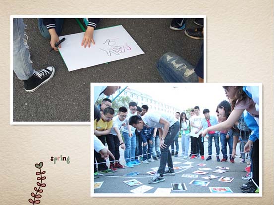 活动分为五个部分:第一部分为“激情热身”,所有队员跟随教官进行身体和情绪的双方面热身,迅速进入拓展训练状态;第二部分为“组成团队”,在三分钟之内自由组合形成12男10女的团队,起好队名,画好队徽,定好口号;第三部分为“信任背摔”,一名队员充分信任队友,站在桌子上笔直后仰,由队友手搭手、肩并肩接住;第四部分为“极速60秒”,通过团队分工和配合在60秒时间内找到含义不同代表1-30不同数字的30张图片;第五部分为“听声进绳”,每个队员蒙上眼睛,完全听队友的指挥跳进绳子围好的圈内。