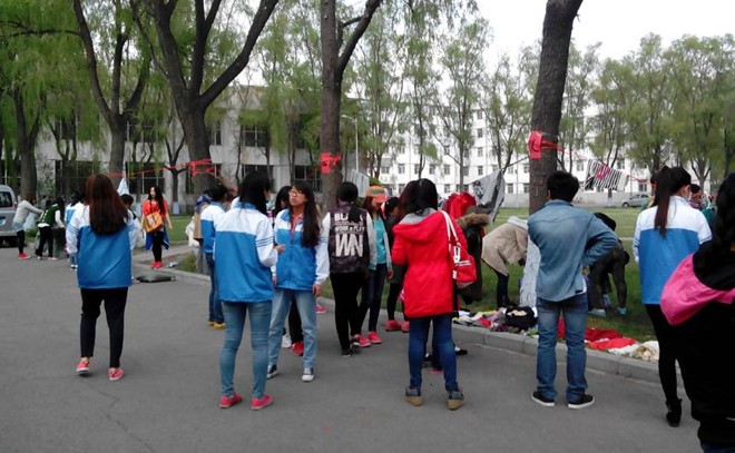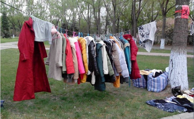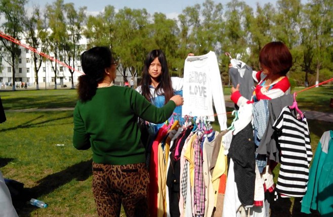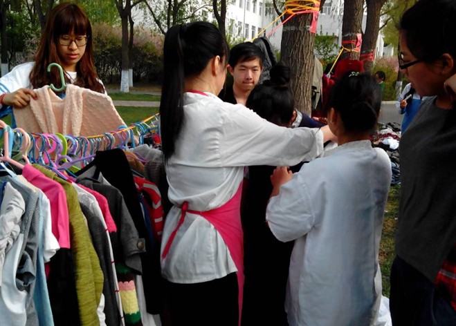 中午十二点半爱心社志愿者们准时在活动地点集合,开始了义卖的前期准备工作。一组志愿者负责将义卖物品从爱心仓库转移至义卖地点,另一组志愿者则负责悬挂爱心义卖宣传条幅,整理、布置义卖衣服所需的绳索等。准备工作繁重而辛苦,但志愿者们依然热情饱满。志愿者们把义卖物品分类,将衣服、裤子、鞋摆放在不同的区域,而衣物按季节和颜色的深浅分别悬挂在不同的地方,由指定的部门负责义卖。经过近一个小时的筹备,义卖活动于13:30正式开始。在义卖活动过程中,志愿者们一直热情的向顾客介绍这次活动的宗旨,同时为前来购买的人们细心的挑选合适的衣物。这些义卖物品均是由爱心社志愿者们在日常走寝回收废旧衣物的活动中获得,大多数都是八成新。物美价廉的商品和同学们的爱心感动着前来购物的人们,义卖活动中的每一幕都能体现出爱心社强大的凝聚力和人们对爱心事业的热情和支持,切实让爱心落实到活动当中。