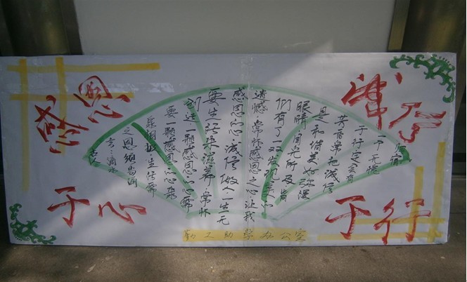 感恩是一种处世哲学,是生活中的大智慧,它可以消解内心所有的积怨,它可以荡涤世界上一切尘埃。感恩,一个我们再熟悉不过的词汇,却蕴含着丰富的人生智慧。有人说:“无信人之言,人实不信。”诚信,一个生活中不可或缺的品质,在人生中起着至关重要的作用。为让广大学生具备诚信、感恩意识,践行诚信、感恩行动,加强个人修养,提高思想道德水准,我院于5月26日设计以“感恩在于心,诚信在于行“为主题的教育宣传板报放于C区食堂门口展示,以丰富多彩的内容提高学生的感恩诚信意识。