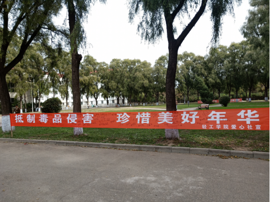 为深入贯彻落实省禁毒办、省教育厅、省人力资源和社会保障厅以及省共青团联合发布的《关于周密组织秋季开学季学校毒品预防教育工作的通知》文件精神,全力推进大学生毒品预防教育深入、常态化开展,轻工学院温暖之旅爱心社面向全院同学举办了为期2个月的系列禁毒活动,活动包括禁毒主题班会、禁毒宣誓、集中观看网络禁毒视频、百人条幅签字、禁毒宣讲,通过禁毒活动大大提升了学生抗毒、防毒的意识。
