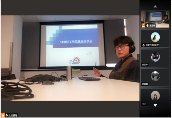 2017级工业二班学生王道楠、包装一班学生朱信卓分享了择业、就业过程中的心得与体会。王道楠介绍了自己的就业过程,指出了要结合自身实际情况确定招聘公司,并说明简历的重要性,与同学们分享了在面试前需要做的准备和面试技巧。朱信卓分享了就业过程中的细节,包括线上面试遇到网络不稳定该如何处理、注意面试礼仪、注意回答问题时语速等,并鼓励大家紧张和迷茫时要多与师长、朋友沟通,要多投递、多面试。