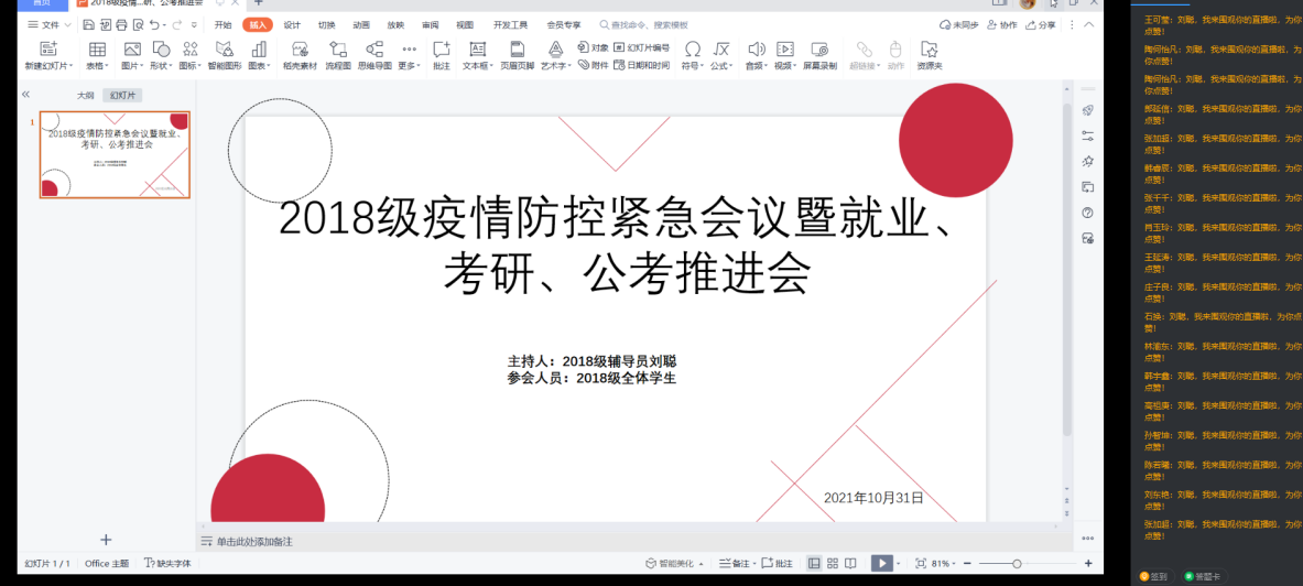 由于目前国内多地有确诊病例散发,疫情防控形势严峻,结合学校疫情防控会议工作要求,以及2018级目前的就业形势,轻工学院2018级于2021年10月31日晚19点,召开疫情防控紧急会议和就业、考研、公考推进会,2018级辅导员刘聪,学院校企合作负责人赵丽丽,2018级全体学生参加本次会议。会议形式为钉钉线上直播,由刘聪主持。