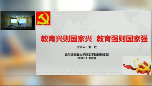 印包党支部书记刘壮,创新党课形式,以“教育兴则国家兴,教育强则国家强”为主题制作了微党课。在视频课上,刘壮书记有数据、有分析、有引用、有立论,通过解读总书记在全国教育大会上的讲话内涵,阐述了教师队伍应具备能力、知识和科研素质;教师应具备的“以德立身、以德立学、以德施教”的师德师风标准;教师“师者人之模范也”的地位,“吐辞为经,举足为法”的言行,对学生“循循善诱、博之以文、约之以礼”的方法,让学生“亲其师、敬其师、信其道”和“欲罢不能、既竭其才”的魅力;引述习总书记对高等教育内涵式发展的要求,结合学校和学院实际,谈了自己对内涵式发展的理解以及内涵式发展保障机制等问题的深入思考。